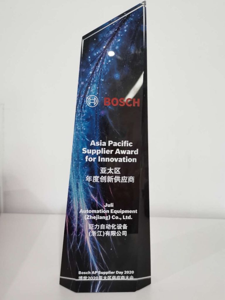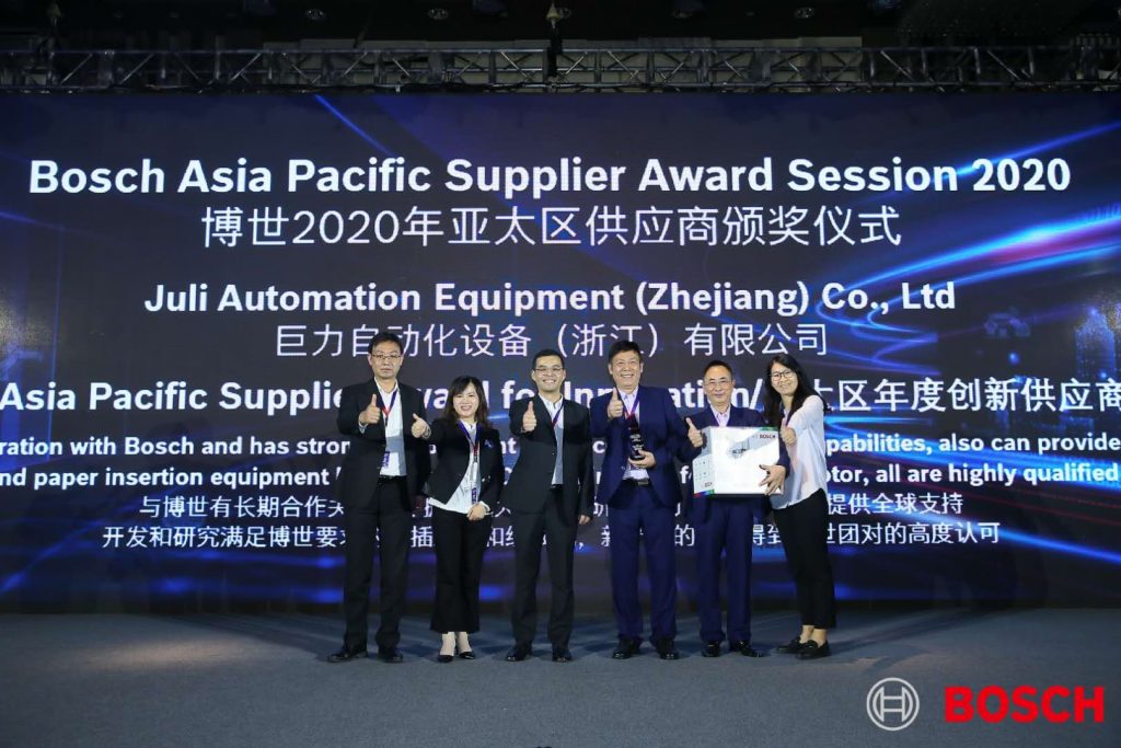 在《博世2020亞太區(qū)供應(yīng)商頒獎儀式》上,巨力自動化公司獨(dú)占鰲頭,從多供應(yīng)商中脫穎而出,獲得了此次博世集團(tuán)頒布的亞太區(qū)供應(yīng)商《亞太區(qū)年度創(chuàng)新供應(yīng)商》獎項(xiàng)。
